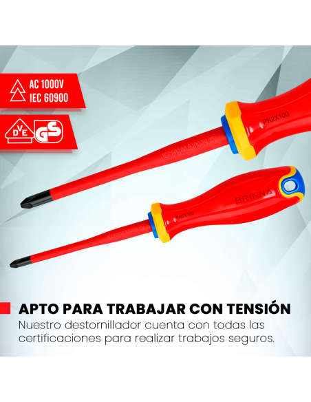 Este destornillador forma parte de la línea Premium de destornilladores aislados de Brinna, es un producto esencial para cualquier electricista o tablerista.