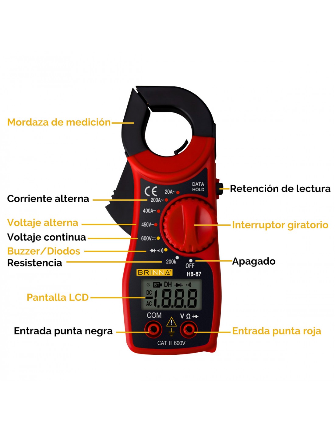 Aplicaciones: Mide corriente CA hasta 400 A, voltaje CA hasta 450 V y CC hasta 600 V, resistencia hasta 20 MΩ. No mide corriente DC.